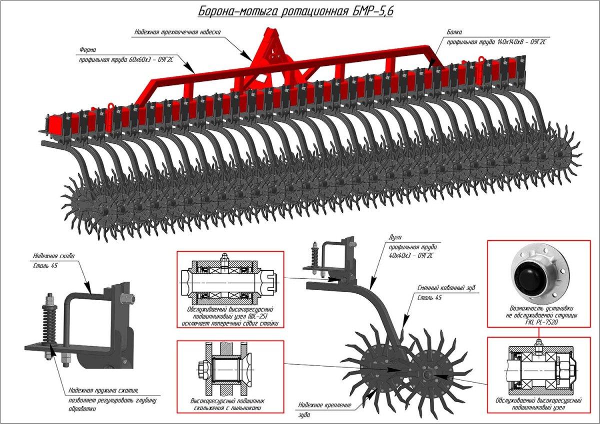 - Все узлы цельносварные. Узлы соединяются между собой стремянками, что позволяет легко и быстро разобрать и собрать борону;