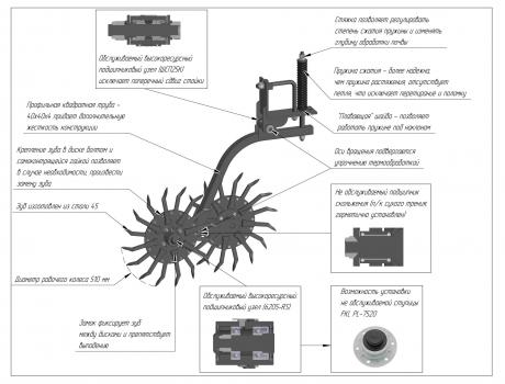 - Колесо состоит из сменного кованного зуба, изготовленного из полосы 8х20, ст45. Разница между конусом зуба и последующим 8 мм, что позволяет увеличить площадь обработки по отношению к другим производителям данной техники. Рабочие органы собраны на корпусах подшипников производства Завода Автотехнологий или на необслуживаемых подшипниках компании FKL;