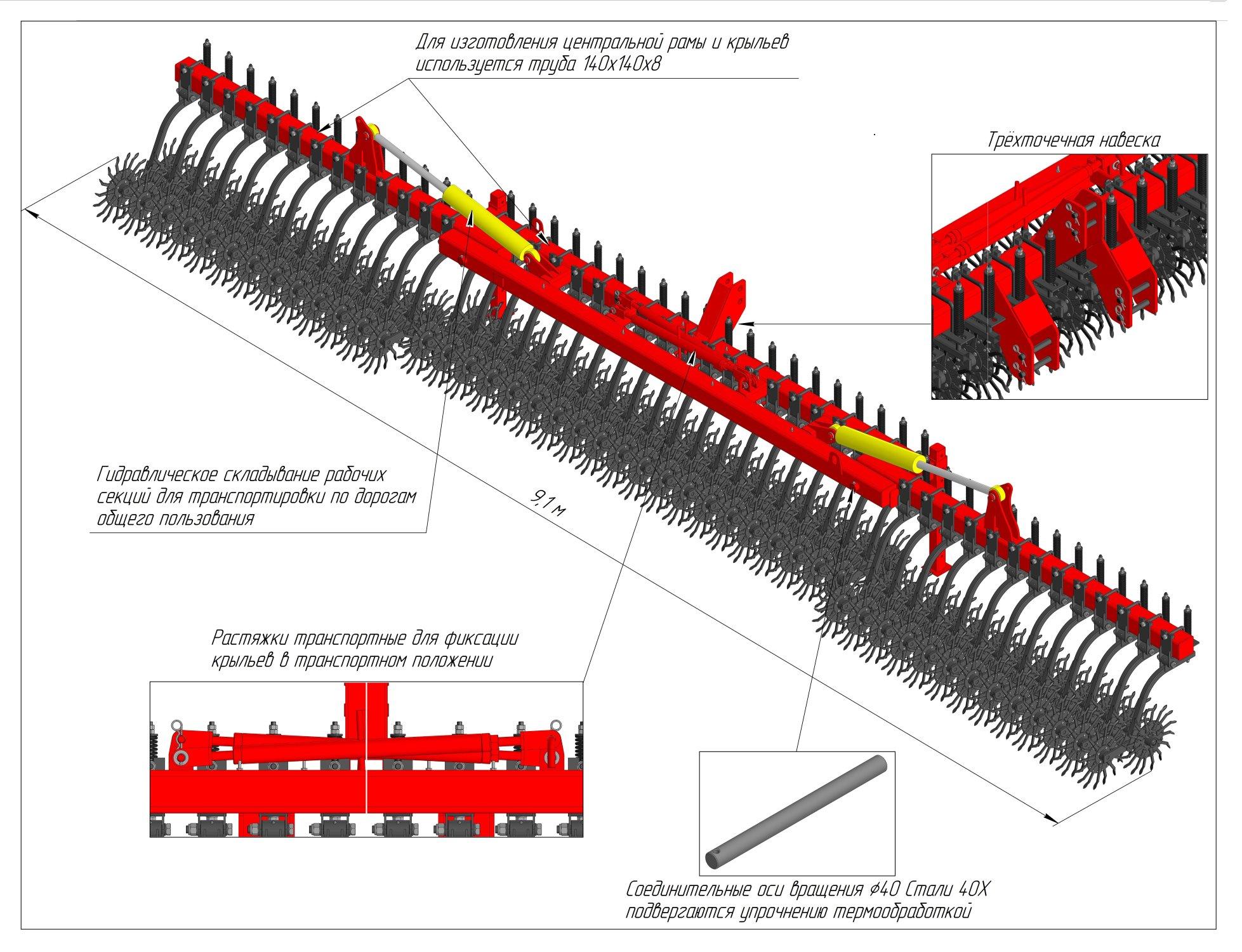 • Все узлы цельносварные. Узлы соединяются между собой стремянками, что позволяет легко и быстро разобрать и собрать борону. Раскладывание в рабочее положение и складывание в транспортное происходит при помощи двух гидроцилиндров;