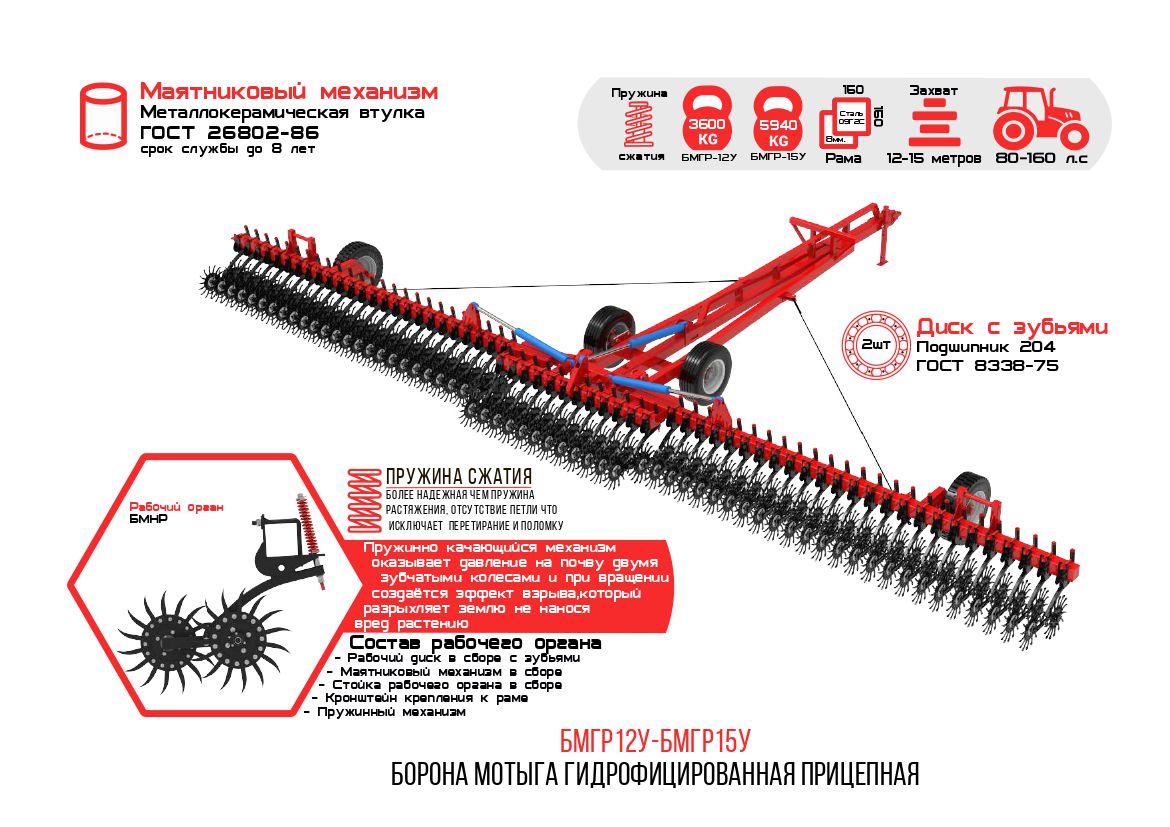 - Борона-мотыга БМГР-15УГ состоит из несущей рамы и боковых крыльев с присоединёнными к ней колёсами солнцеобразного типа, которые имеют диаметр до 60 см и располагаются несколькими блоками на подпружиненном качающемся рычаге, гидроцилиндров, сницы, транспортных колес;