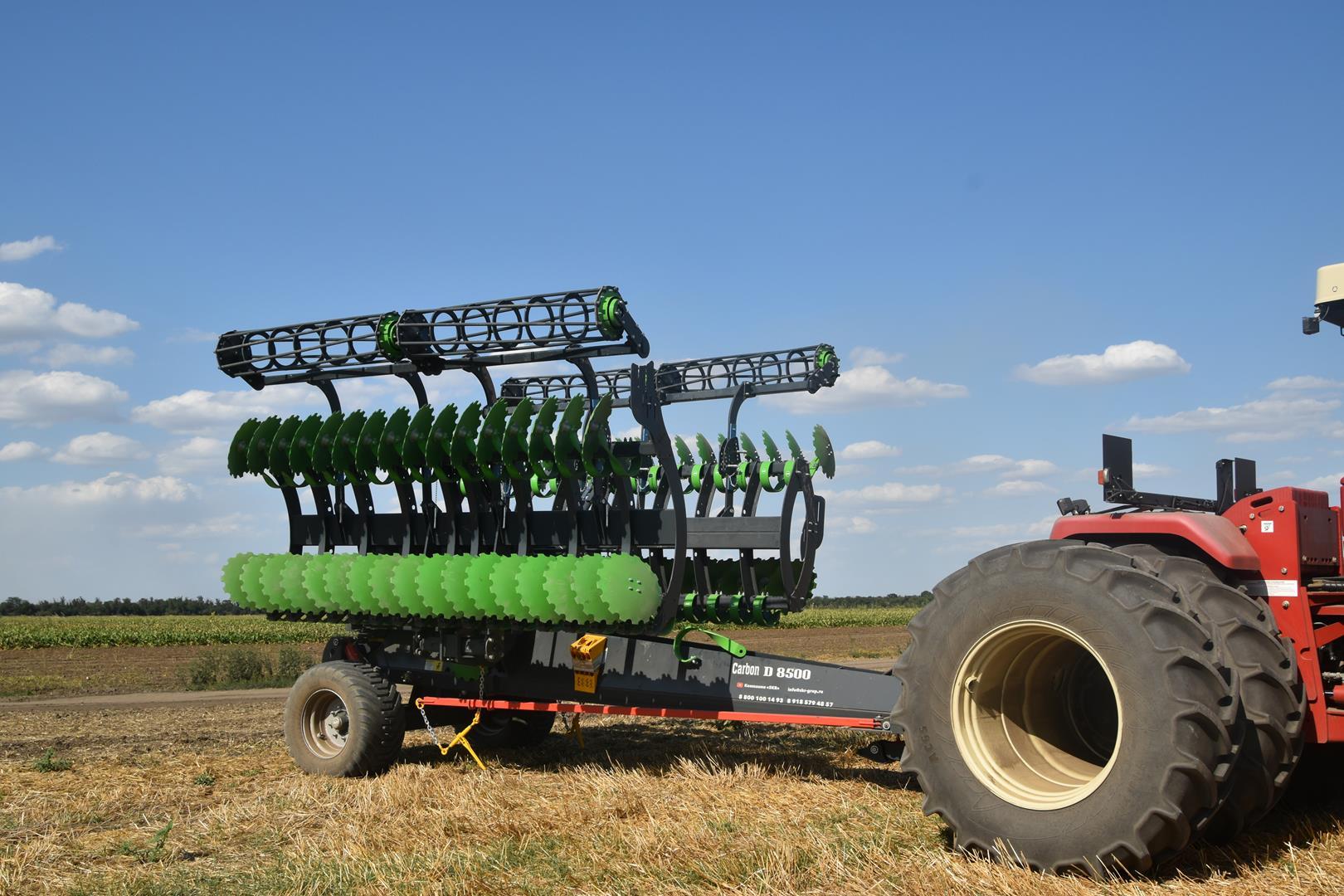 Дисковая борона Carbon D8500 на подпружиненной стойке (3D), как и лущильник, предназначены как для поверхностной стерневой обработки на лёгких и средних почвах, так и для предпосевной обработки почвы для посева по мульче или после вспашки. Может работать по влажной почве не забиваясь, идеально копирует практически любой рельеф почвы, за счет пружинной стойки, выдерживает заданную глубину по всей ширине захвата, работает на глубину от 3 см до 15 см, сборка бороны дисковой SKR производится на 90% из комплектующих нашего производства исключение составляют: гидроцилиндры, колеса, подшипники.