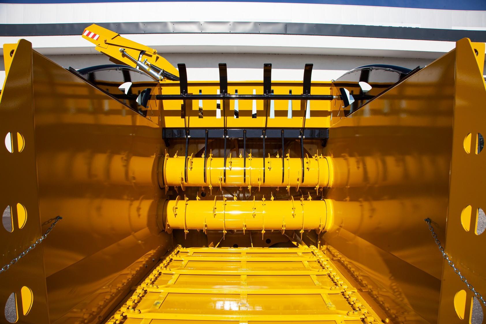 Рулоны загружаются при помощи заднего гидравлического борта и, с помощью напольного транспортера, перемещаются к паре измельчающих барабанов. Далее измельченный материал подается к распределительному вентилятору и выдувается через верхний поворотный раструб. Барабаны и вентилятор приводятся от ВОМ трактора через 2-х скоростной редуктор (270-540 об/мин). Бесступенчатая регулировка скорости напольного транспортера. Комбинацией этих параметров, можно получить фракцию измельчения от 5 до 10 см (в зависимости от продукта). Кроме того, машина оснащена ограничительной гребенкой, которая дозирует подачу материала, и соответственно, плотность и фракцию измельчения.