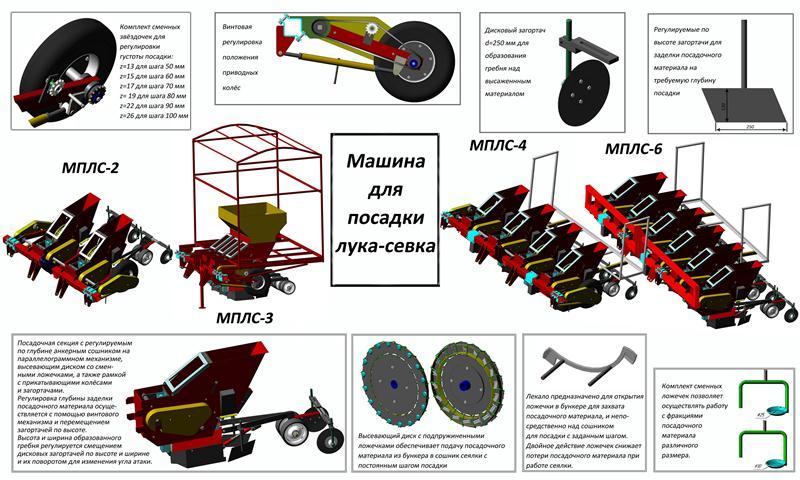- Сажалка лука МПЛС-4 состоит из рамы, высаживающих секций с прикатывающими рамками, регулируемых приводных колес;