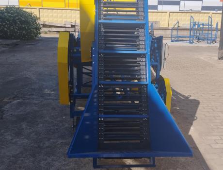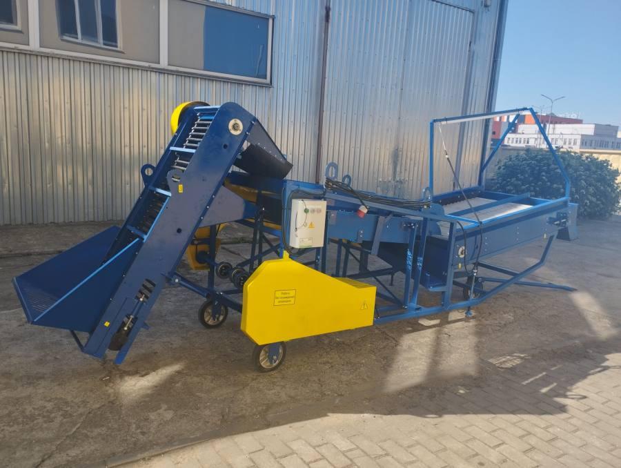 • Картофель засыпается в приемный ковш, откуда при помощи транспортера попадает в сортирующее устройство. На протяжении движения по приемному транспортеру картофель очищается от мелкой грязи и примесей;