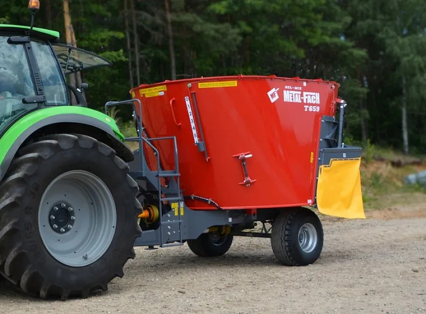 Миксер-кормораздатчик вертикальный Metal-Fach T659/11 (7 м3, Standart) используется для приготовления, транспортировки и дозировки корма непосредственно в кормушки скота. Благодаря своим габаритам и маневренности кормораздатчик BelMix предназначен, в частности, для хозяйств, имеющих коровники с узкими кормовыми проходами и низкими въездными воротами. Кормораздатчик Metal-Fach Т-659 работает с тракторами, имеющими два исправных разъема внешней гидравлической системы, разъем для подключения тормозной системы и гнездо для подключения электрической системы 12 В и верхнее устройство навески или сцепку для сельскохозяйственных машин, переносящую вертикальную нагрузку мин. 30 кН. Кормораздатчик оснащен поворотной тягой с петлей 45 мм. При использовании двухступенчатой передачи минимальная мощность трактора составляет 40 кВт. Для загрузки объемных кормов в рулонах (сенаж, силос, солома, сено) в бункер кормораздатчика следует использовать фронтальные или телескопические погрузчики.
