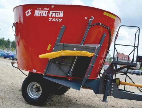 Миксер-кормораздатчик вертикальный Metal-Fach T659/7 (8 м3, Standart) используется для приготовления, транспортировки и дозировки корма непосредственно в кормушки скота. Благодаря своим габаритам и маневренности кормораздатчик предназначен, в частности, для хозяйств, имеющих коровники с узкими кормовыми проходами и низкими въездными воротами. Кормораздатчик Metal-Fach Т-659 работает с тракторами, имеющими два исправных разъема внешней гидравлической системы, разъем для подключения тормозной системы и гнездо для подключения электрической системы 12 В и верхнее устройство навески или сцепку для сельскохозяйственных машин, переносящую вертикальную нагрузку мин. 30 кН. Кормораздатчик оснащен поворотной тягой с петлей 45 мм. При использовании двухступенчатой передачи минимальная мощность трактора составляет 40 кВт. Для загрузки объемных кормов в рулонах (сенаж, силос, солома, сено) в бункер кормораздатчика следует использовать фронтальные или телескопические погрузчики.