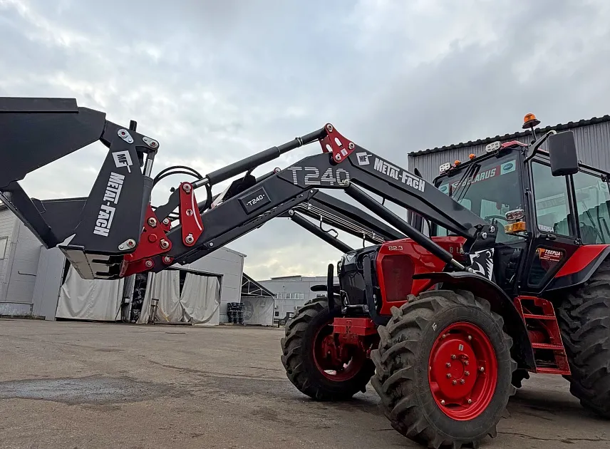 Погрузчик фронтальный Metal-Fach T-240/1 "Медведь" (грузоподъемность 1700 кг, высота погрузки 4000 мм, быстросъемные крепления с трактора, быстросъемные крепления рабочих органов EURO, уровень горизонта, с третьей секцией, с джойстиком и функцией плавающего положения) - это воплощение инноваций, мощности и комфорта. С грузоподъемностью 1700 кг и высотой подъема 4 метра он готов к самым сложным задачам.