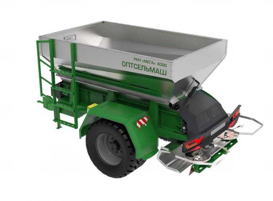 Разбрасыватель минеральных удобрений РМУ-4000-П "Мега" (с к/валами, лестница, метриал 3 мм нержавеющая сталь) - предназначен для перевозки и поверхностного внесения твердых минеральных удобрений с последующей заделкой их почвообрабатывающими орудиями, а также для подкормки зерновых и пропашных культур, лугов и пастбищ.