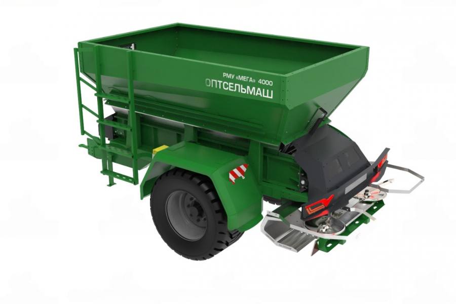Прицепной разбрасыватель минеральных удобрений РМУ-4000-П "Мега" состоит из кузова с рамкой, редуктора для привода рабочих органов, комплекта карданных валов, гидроцилиндра шиберной заслонки, гидропривода транспортерной ленты, транспортера, рассеивающих центробежных дисков, дозирующих заслонок, туконаправителя, пневматического тормоза, а также на агрегате установлено светосигнальное оборудование.
