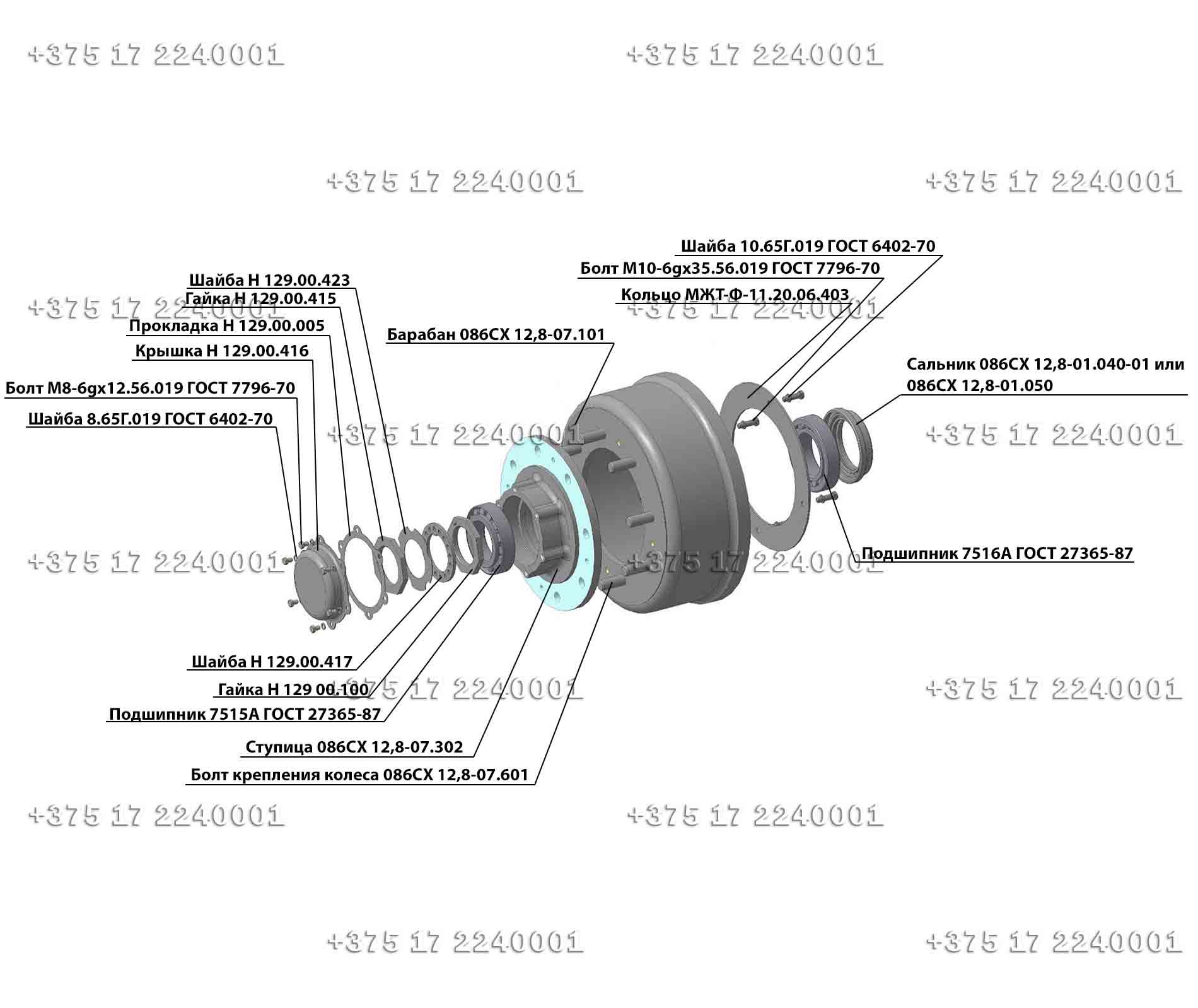 Ступица 086СХ12,8-07.302 в сборе применяется на машинах для внесения жидких органических удобрений МЖТ-Ф-6, МЖТ-Ф-11. Производитель - Республика Беларусь.