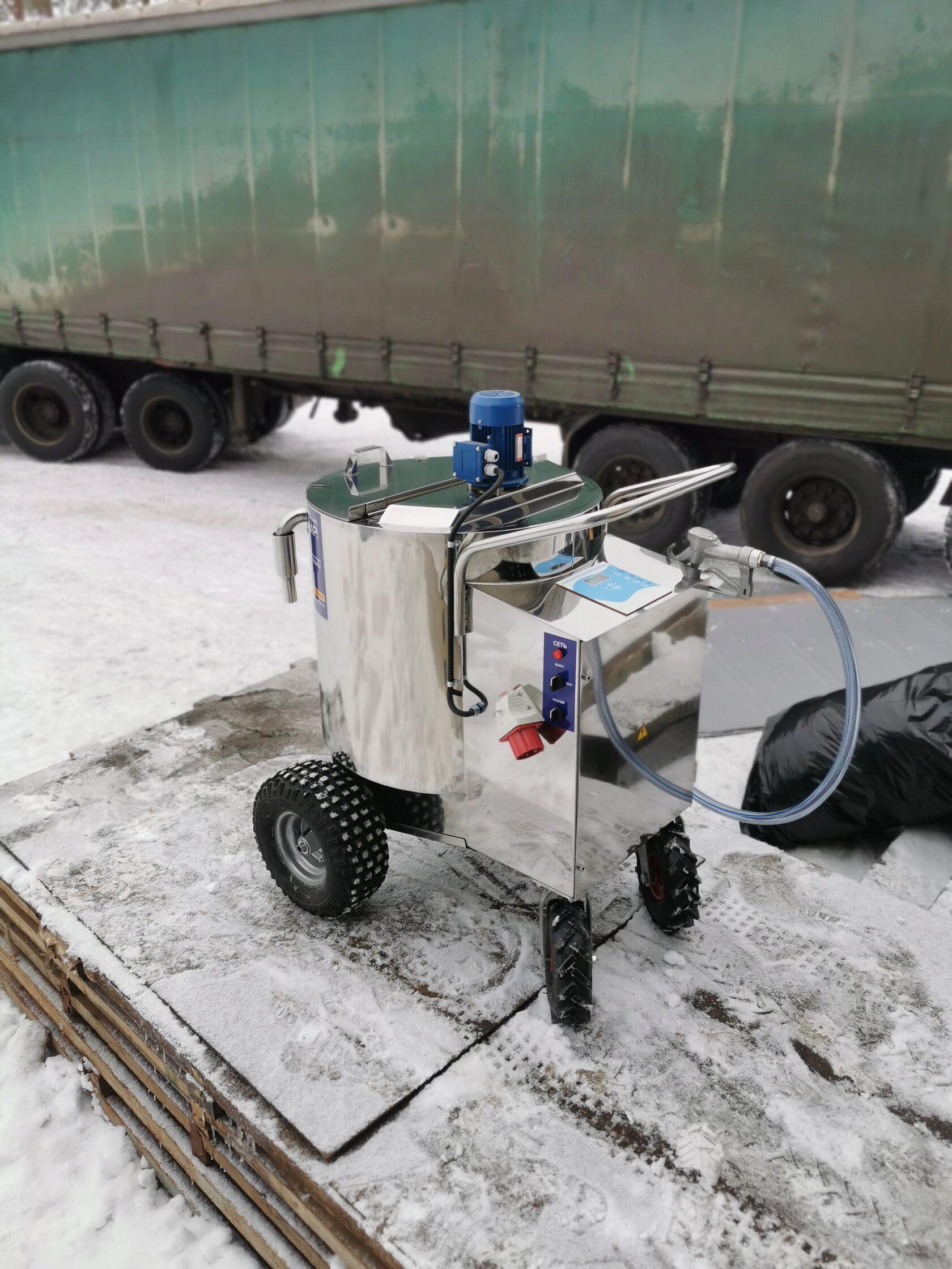- На платформе установлена нержавеющая емкость типа «термос» с системой подогрева, подставка под вёдра, перекачки смеси из полости бака в емкость для кормления;