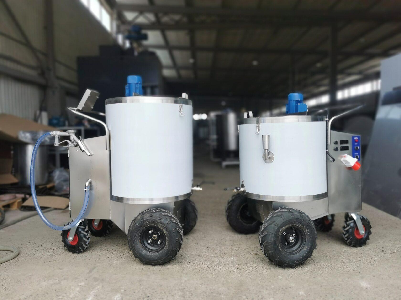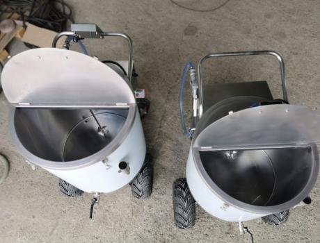 • На платформе установлена нержавеющая емкость типа «термос» с системой подогрева, подставка под вёдра, перекачки смеси из полости бака в емкость для кормления;