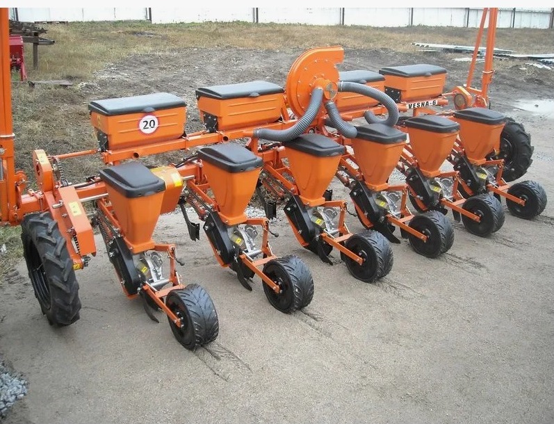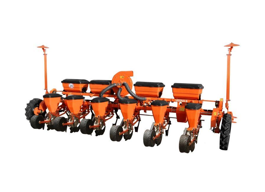 Сеялка пневматическая точного высева Весна-6 (УПС-6-02) предназначена для пунктирного высевания калиброванных и некалиброванных семян кукурузы, подсолнечника, клещевины, сорго, сои, а также семян кормовых бобов, фасоли, люпина с одновременным, раздельным от семян внесением гранулированных минеральных удобрений и прикатыванием почвы в рядках. Сеялка пропашная обеспечивает посев на конечную густоту, исключая применение ручного труда при формировании требуемого интервала между растениями. Также возможен высев некалиброванных семян, но в таком случае точность будет прямо зависеть от величины в размерах и степени поврежденности посевного материала.