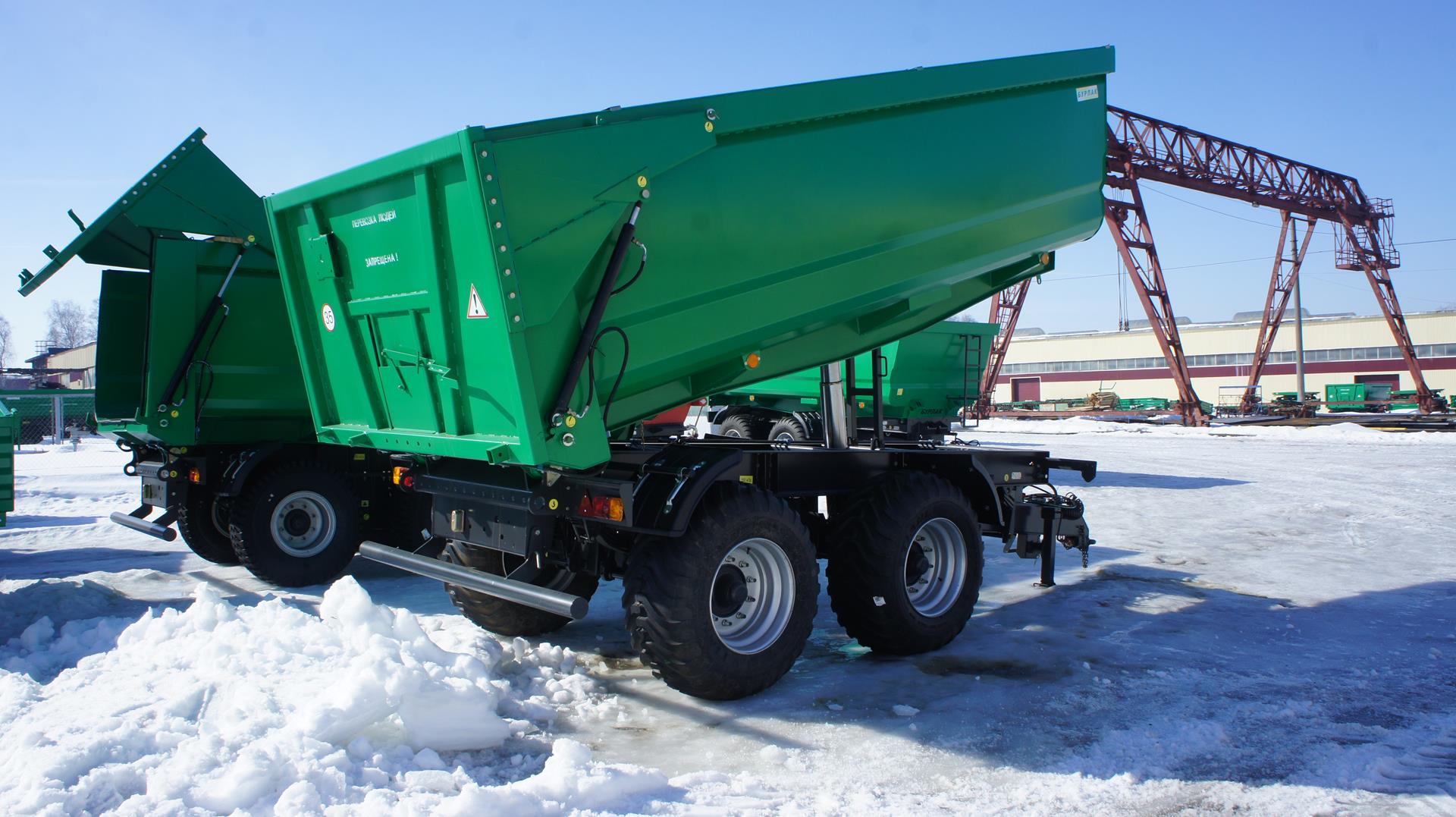 Свал груза с платформы назад. Полуприцеп предназначен для эксплуатации с колёсными тракторами классов 3,0 - 5,0.