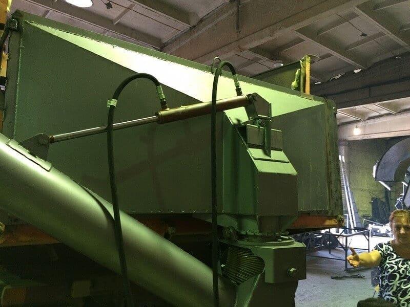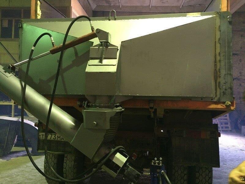 • При подъеме кузова, транспортируемый материал ссыпается по конусу бункера и попадает в приемную часть трубы навесной;